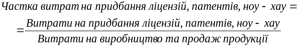 - частка витрат на придбання ліцензій, патентів, ноу-хау у загальній сумі витрат підприємства показує величину грошових коштів, які підприємство може витратити на придбання прав по використанню новітніх технологій: