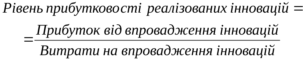 - рівень прибутковості (рентабельності) реалізованої інновації. Економічна ефективність впроваджених у діяльність інноваційних процесів обчислюється за допомогою даного показника: