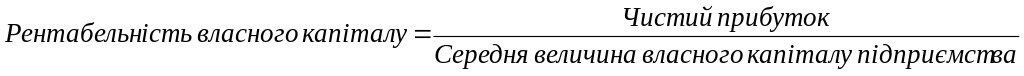 - рентабельність власного капіталу – це показник ефективності використання активів, створених за рахунок власних коштів. Цей показник має важливе значення, оскільки в ньому враховують, з одного боку, прибуток від основної діяльності без надзвичайної діяльності, а з другого – кошти, зайняті у виробничій діяльності.