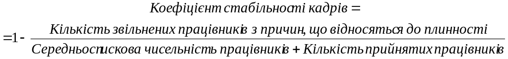 - коефіцієнт стабільності кадрів є важливим показником кадрової політики на підприємстві. Коефіцієнт стабільності кадрів, використовуваний для оцінки рівня організації управління і кадрової політики, обчислюють за формулою: