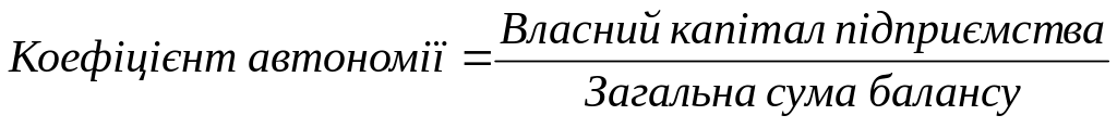 - коефіцієнт автономії (фінансової незалежності). Фінансово стійким можна вважати таке підприємство, яке за рахунок власних коштів спроможне забезпечити запаси й витрати, не допустити невиправданої кредиторської заборгованості, своєчасно розрахуватись за своїми зобов’язаннями. Серед різних коефіцієнтів фінансової стійкості рівень фінансової незалежності підприємства відображає саме показник автономії. Даний коефіцієнт обчислюється за формулою: