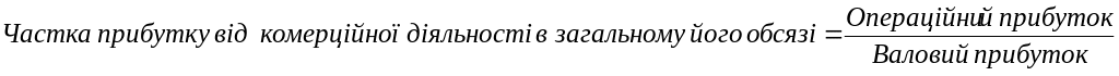 - частка прибутку від комерційної діяльності підприємства в загальному його обсязі. Цей показник є визначальним при оцінці якості підприємства, функціонування та управління маркетинговою системою підприємства, оскільки кінцевою ціллю будь-якого комерційного підприємства є максимізація прибутку. Визначається за формулою: