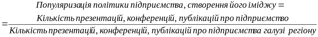 - популяризація політики підприємства, створення його іміджу відображається в кількості проведених презентацій, конференцій, надрукованих публікацій, проведених соціологічних опитувань, спрямованих на підвищення суспільної думки про діяльність підприємства. Даний показник визначається за формулою: