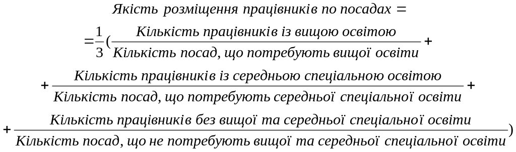 - якість розміщення працівників по посадах. Даний показник відображає якість підбору кадрів і необхідність підвищення кваліфікації персоналу та визначається за формулою: