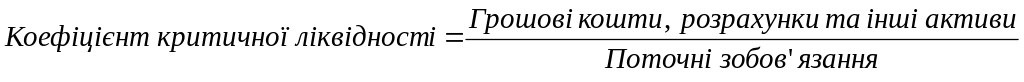 - коефіцієнт критичної (термінової, швидкої) ліквідності аналогічний коефіцієнту покриття, але обчислюється за вужчим колом поточних активів (з розрахунку виключають найменш ліквідну їх частину – виробничі запаси). Кошти, які можна отримати в разі вимушеної реалізації виробничих запасів, можуть бути суттєво меншими за витрати на їх придбання. Даний показник обчислюється за формулою: