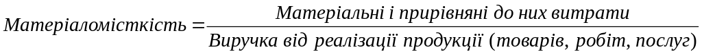 - матеріаломісткість є загальним показником, оберненим до матеріаловіддачі і відображає вартість матеріальних і прирівняних до них витрат на одну гривню реалізованої продукції. Даний показник визначається за формулою: