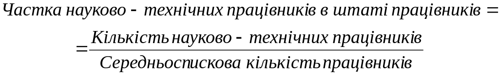 - частка науково-технічних працівників в загальній кількості працюючих. Даний показник показує, чи є в складі працівників підприємства науково-технічні працівники, які можуть проводити науково-дослідні та дослідно-конструкторські роботи: