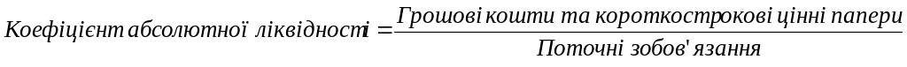 - коефіцієнт абсолютної ліквідності (платоспроможності) є найжорсткішим критерієм ліквідності підприємства і показує, яку частину короткострокових зобов’язань можна за потреби погасити негайно. Цей показник обчислюється за формулою: