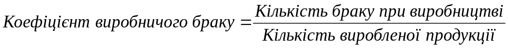 - коефіцієнт виробничого браку є показником якості виготовленої продукції і обчислюється за формулою: