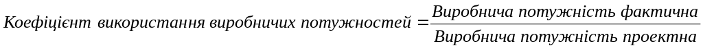 - коефіцієнт використання виробничих потужностей дозволяє визначити максимально можливий випуск продукції підприємством за певний час у встановленій номенклатурі і асортименті при повному завантаженні обладнання і виробничих площ. Даний показник відображає ефективність використання наявних у підприємства обладнання і виробничих площ і розраховується за паспортами на обладнання та використовуваними площами і обчислюється за формулою: