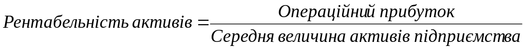 - рентабельність активів. Для оцінки діяльності підприємства найважливіше значення має показник рентабельності активів. Цей показник також може використовуватись для вивчення попиту на продукцію. На зміну рентабельності активів впливають зміни рівнів фондовіддачі та оборотності матеріальних оборотних коштів, а також рентабельності (доходності) обсягу реалізації продукції.
