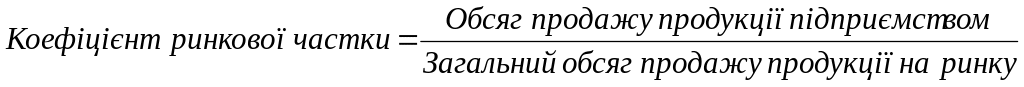 - коефіцієнт ринкової частки, який характеризує нішу, яку займає підприємство на ринку: