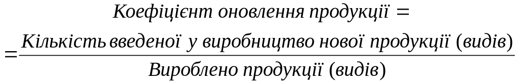 - коефіцієнт оновлення продукції показує, наскільки підприємство здатне до зміни асортименту продукції, що виробляється. Даний показник обчислюється за формулою: