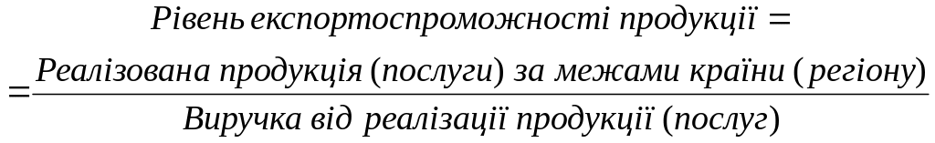 - рівень експортоспроможності продукції відображає конкурентноздатність продукції підприємства за межами країни (регіону). В залежності від галузевої специфіки даний показник обчислюється або в межах країни, або в межах регіону: