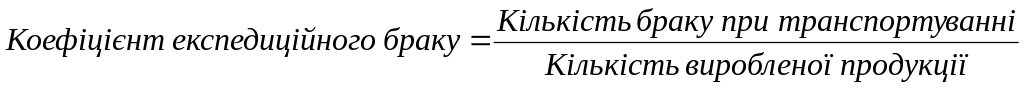 - коефіцієнт експедиційного браку відображає частку бракованої продукції при її транспортуванні і визначається за формулою: