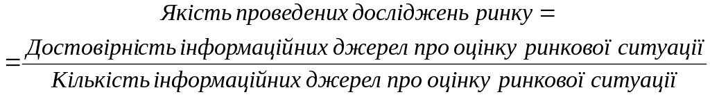 - якість проведених досліджень ринку відображає кількість і достовірність інформації за певний період часу про оцінку ринкової ситуації, іншими словами, аналіз зовнішнього середовища. Даний показник визначається експертно за формулою: