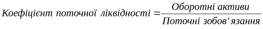 - коефіцієнт поточної ліквідності (коефіцієнт покриття) характеризує співвідношення оборотних активів і поточних зобов’язань (короткострокових зобов’язань та короткострокових пасивів):
