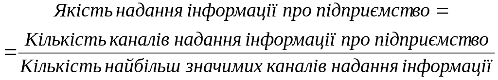 - якість надання інформації про підприємство. Даний показник характеризує зв’язки з пресою, радіо, телебаченням, можливість надання інформації про підприємство в найбільш значимих для нього засобах масової інформації (преса, радіо, телебачення, інтернет та ін.) та обчислюється за формулою: