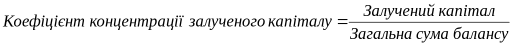 - коефіцієнт концентрації залученого капіталу характеризує частку запозичених коштів підприємством в загальній сумі коштів, інвестованих у його діяльність. Чим нижчий цей коефіцієнт, тим більш фінансово стійким і незалежним від кредиторів є підприємство. Даний показник обчислюється за формулою: