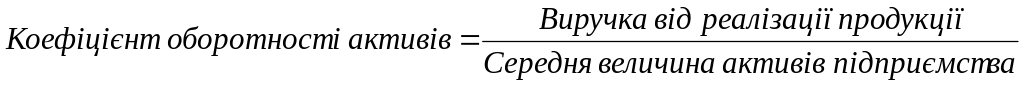 - коефіцієнт оборотності активів – це показник кількості оборотів активів підприємства за певний період. Даний показник визначається за формулою: