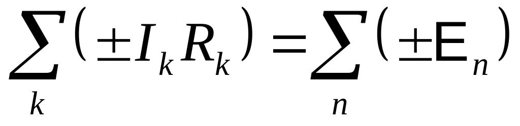 Падение напряжения берется со знаком "+", если ток направлен в сторону обхода контура, и "-" в противном случае. ЭДС берется со знаком "+", если она действует в направлении обхода, и "-" – в противном случае. Направление обхода выбирается произвольно. Для определенности выберем направление обхода по часовой стрелке.