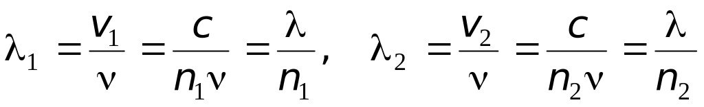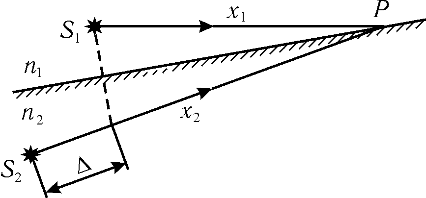 Выясним условия возникновения интерференционных максимумов или минимумов при интерференции волн от двух когерентных источников S1 и S2. В общем случае эти источники могут находиться в различных средах с показателями преломления n1 и n2. При этом оптические когерентные источники излучают световые волны с одинаковой частотой , но различными длинами волн: