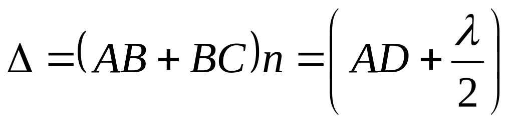 Необходимость учета дополнительного слагаемого /2 связана с тем, что условия отражения световых лучей в точках A и B различны. В точке A отражение происходит от оптически более плотной среды; при этом фаза световой волны изменяется на , что эквивалентно разности хода /2. В точке B световая волна отражается от оптически менее плотной среды и ее фаза при этом не изменяется.