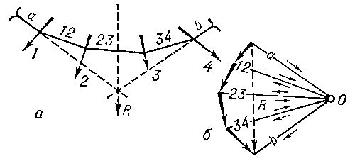 графический метод отыскания опорных реакций и равнодействующих системы сил, построения эпюр изгибающих моментов, определения рациональных очертаний арочных и висячих систем и решения др. задач статики плоских систем. В основу построения В. м. положено представление о многоугольнике, образованном осью закрепленной по концам невесомой нити (верёвки), натянутой действующими на неё силами. Построение В. м. совместно с силовым многоугольником (рис.) применяется также для определения геометрических характеристик плоских сечений, решения некоторых задач инженерной гидравлики, экономики и др.