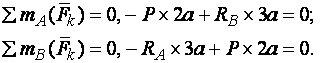 Так как сила Р = 120 кН, приложенная к узлу фермы F, вертикальна и реакция шарнирно-подвижной опоры В, перпендикулярная опорной плоскости, тоже вертикальна, то линия действия реакции шарнирно-неподвижной опоры Адолжна быть параллельна им, т.е. должна быть тоже вертикальна. Тогда для полученной плоской системы параллельных сил по формулам (3.8) получим: