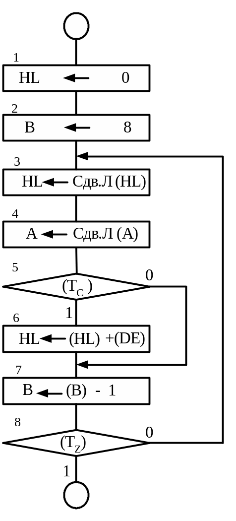 6. Складываются содержимое пары регистров HL и пары DE (множимое).