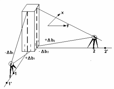 Проверка вертикальности колонн, высотой более 5 м проводится способом наклонного проектирования с использованием теодолита. В этом случае строго в створе разбивочной оси на расстоянии от колонны немногим более ее высоты устанавливают теодолит в точке 1 (рис. 33).