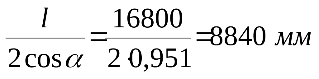 Принимаем в качестве несущих конструкций покрытия фермы треугольного очертания с расчетным пролетом l=16,8м, высотой в коньке h=l/6=2,8м. Уклон верхнего пояса фермы: α=18° (cos18°=0,951). Расстояние между фермами вдоль здания принимаем 6м. Углы наклона и длины элементов фермы определены без учета строительного подъема: