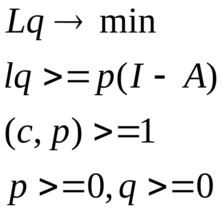 Можна інтерпретувати вектор p як вектор цін на продукти, а число q як ставку зарплати (зарплата на людино-день чи годину чи одного працівника). Тоді задача (3) зводиться до визначення p і q так, щоб мінімізувати загальний фонд зарплати Lq за умови pj – (aj, p) <= 0 j = 1,2, … n (чистий прибуток будь – якої галузі не є додатним)