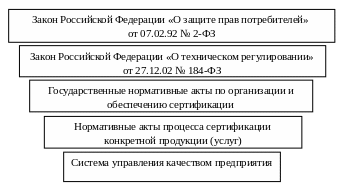 Верхний уровень сферы государственной сертификации характеризуется важнейшим законом, напрямую связанным с качеством продукции – Законом «О защите прав потребителей», который в правовом аспекте закрепляет право каждого гражданина на качественную продукцию, соответствующую установленным требованиям, которые отражают его потребности. Закон обязывает производителя учитывать интересы потребителя и выпускать продукцию с уровнем качества, который бы не ущемлял прав потребителя и не приносил бы вреда его здоровью. Право потребителя на качественную продукцию – это право на обеспечение его растущих потребностей. Этот закон ставит Россию в ряд высокоцивилизованных государств, где интересы покупателя выше интересов производителя и деятельность последнего в значительной степени зависит от покупателя.