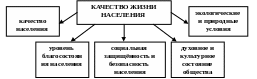 Качество населения интегрирует в себе такие свойства как: способность изменять свою численность и поддерживать равновесие биологических функций образующих его поколений (рождаемость, смертность, заболеваемость). Мы исходим из того, что качество населения представляет собой не отделимую от жизнедеятельности населения и вытекающую из самого факта его существования определенность, интегральную совокупность более частных свойств, которыми обладает население и которые проявляются во взаимодействии с различными явлениями окружающего мира.