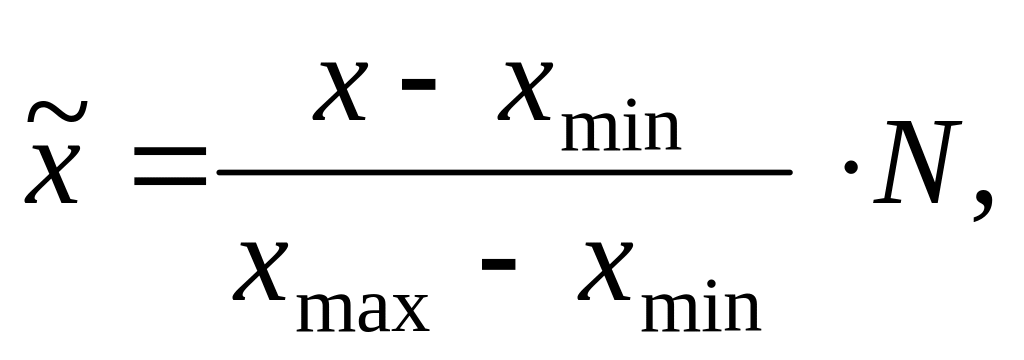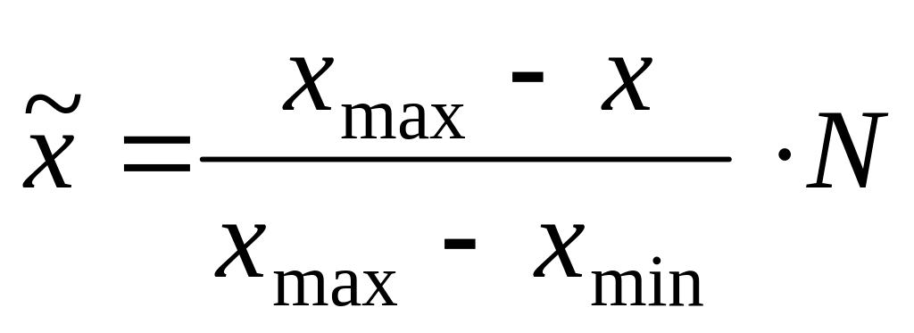 б) Если исходный показатель (частный критерий) х связан с анализируемым интегральным свойством качества жизни монотонно-убывающей зависимостью (т.е. чем больше значение х, тем ниже качество), то значение соответствующей унифицированной переменной подсчитывается по формуле