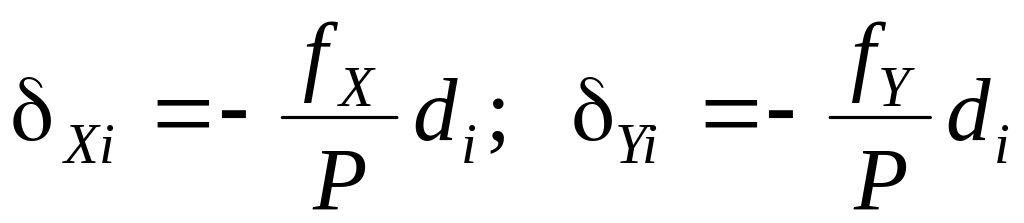 где Xi и Yi – поправка в приращение по оси Х и Y, соответственно, м; fX и fY – невязки по осям, м; Р – периметр (сумма сторон), м; di – горизонтальное проложение, м.