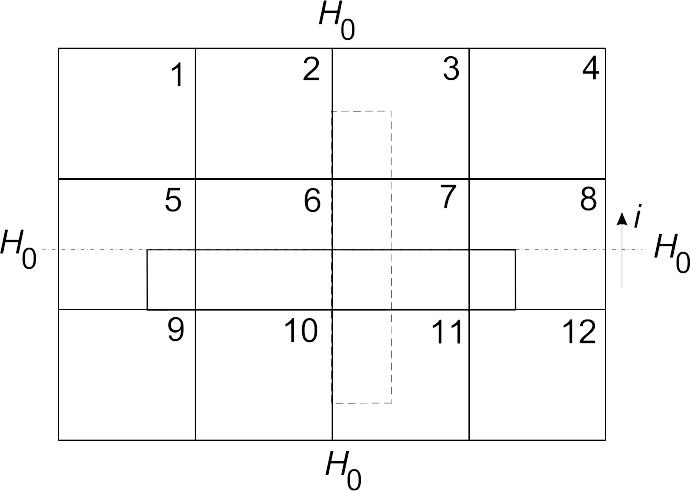 У квадратах, через які проходить лінія нульових робіт, необхідно окремо обчислити обсяги зрізання і підсипання кожної з двох фігур. Якщо ділянки зрізання або підсипання мають форму трапеції, як на квадратах 3 або 10 (див. рис. 5), тоді обсяг зрізання або підсипання обчислюється за формулою