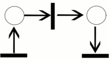 Пример сети Петри. Белыми кружками обозначены позиции, полосками — переходы, чёрными кружками — метки.