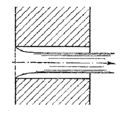 При истечении жидкости происходит сжатие струи, вследствии того, что частицы жидкости подходят к отверстию с разных сторон и по инерции движутся в отверстии по сходящимся траекториям. Параллельное течении струи в отверстии возможно только в том случае, когда толщина стенок сосуда близка к размерам отверстия, а стенки отверстия имеют плавные очертания с расширением внутрь сосуда. При этом отверстие превращается в коноидальный осадок.