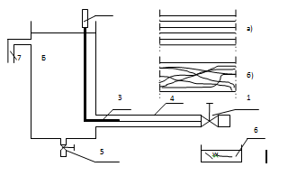 Рейнольдс пропускал жидкость из бака Б, в котором с помощью перелива 7 поддерживался постоянный уровень, через стеклянные трубки различного диаметра, регулируя скорость движения жидкости в них кранами 1 и 5. По тонкой трубке 3 с заостренным концом ко входу в стеклянную трубку 4 подводилась окрашенная жидкость из сосуда 2. Средняя скорость V в трубке 4, имеющей площадь сечения со определялась по объему жидкости W, поступившей в мерный сосуд 6 за время t (рис .).