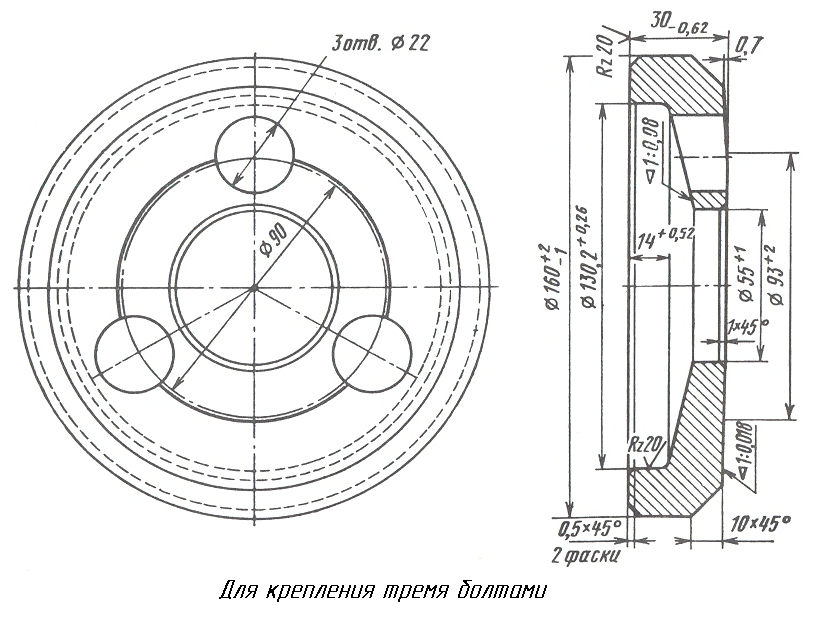 Шайба тарельчатая предназначена для передачи усилия затяжки болтов М20 торцевого крепления подшипников на оси на внутренние кольца подшипников, изготавливается из стали марок 38ХС, 40Х, 45Х по ГОСТ 4543 и должна соответствовать размерам, приведенным на рисунке 10.9.