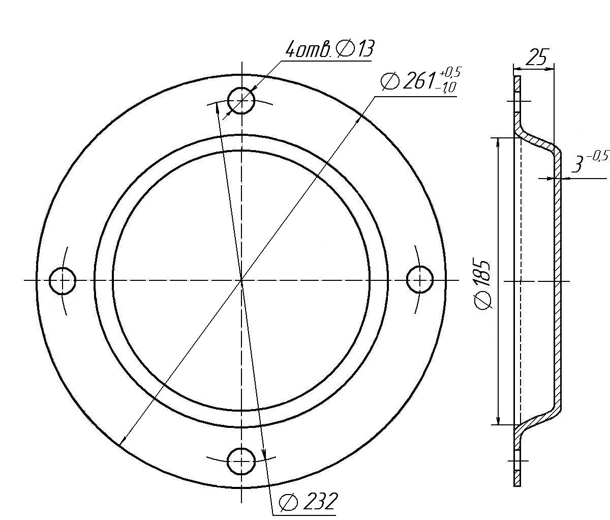 10.2.2 Крышка смотровая применяется для уплотнения буксового узла и упрощения осмотра его передней части. Она устанавливается в торцевую часть крышки крепительной и прикрепляется болтами М12х35 для фиксации плоского резинового уплотнительного элемента. Крышка смотровая изготавливается из стали марки ст10 кп по ГОСТ 16523 из листа 6-3 ГОСТ 19903 и должна соответствовать размерам, приведенным на рисунке 10.5.