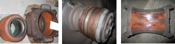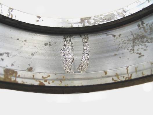 1.3.21 Проворачивание внутреннего кольца на шейке оси (потеря посадочного натяга) - ослабление прессового соединения внутреннего кольца с осью с последующим его круговым перемещением относительно шейки оси, лабиринтного, внутреннего и приставного упорного колец.