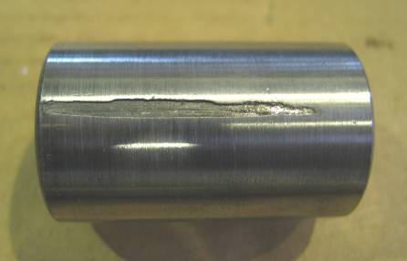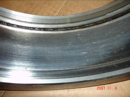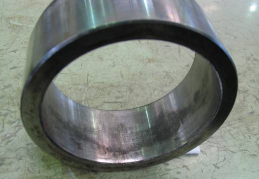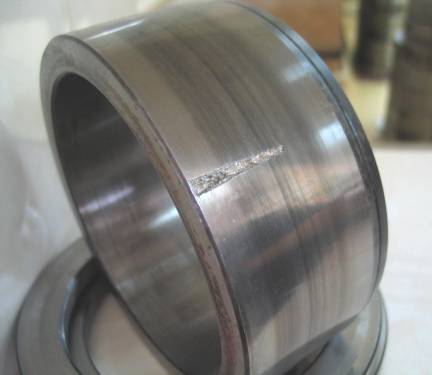 Визуальный контроль, НК. Отличительной особенностью трещины, приводящей к разрыву кольца является ее ориентация параллельно оси, незакатаные края и стреловидность. Дефект наиболее характерен для колец, изготовленных из насквозь каленой стали (ШХ15, ШХ15СГ и т.д.). |