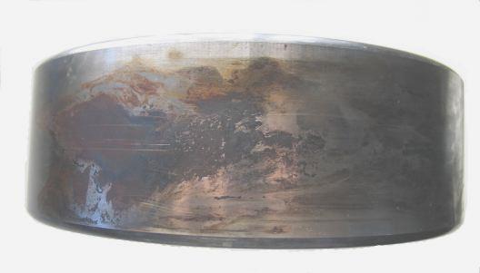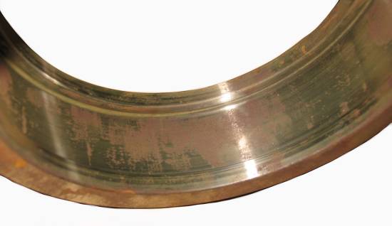 1.5.06 Износ торцевых поверхностей (фретинг-коррозия) - естественный процесс, приводящий к окислению торцевых поверхностей кольца при его работе в условиях взаимного перемещения относительно элементов торцевого крепления и внутреннего кольца переднего подшипника как во влажной среде, так и при ее отсутствии.