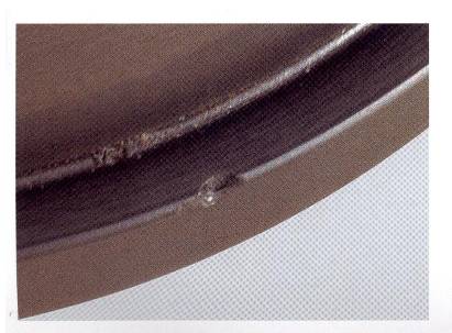 1.2.17 Задиры на бортике (типа "елочка") - естественный процесс, приводящий к изменению поверхностных слоев бортика кольца под действием высоких контактных давлений при разрыве масляной пленки и проявляющийся в виде выровов металла как хаотично расположенных, так и в виде строго геометрического рисунка ("елочка").