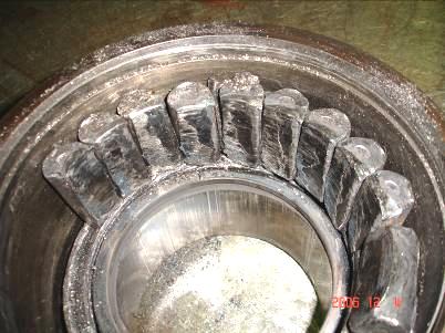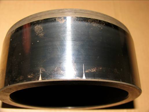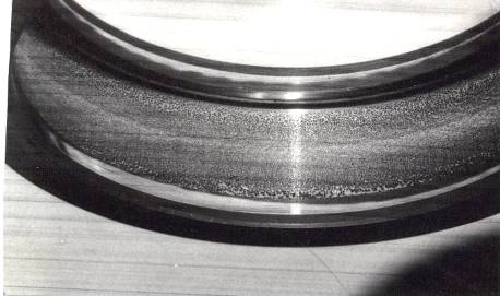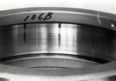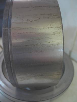 1.5.04 Задиры на торцевой поверхности (типа "елочка") - естественный процесс, приводящий к изменению поверхностных слоев кольца под действием высоких контактных давлений при разрыве масляной пленки и проявляющийся в виде выровов металла как хаотично расположенных, так и в виде строго геометрического рисунка ("елочка").