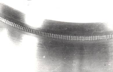 Визуальный контроль. Дефект аналогичен повреждениям наружного и внутреннего колец, называемого "рифлением", но при этом нет четко выраженных отдельных полос, так как за один оборот внутреннего кольца ролик совершает несколько оборотов, что приводит к получению сплошной темной полосы – электроожога. |