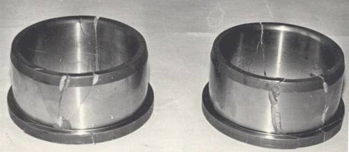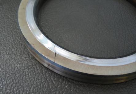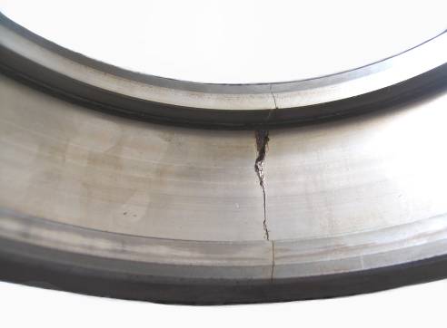 1.5.02 Трещина - нарушение целостности кольца, вызванное: перегрузками, создающими высокие напряжения и приводящими к растрескиванию и раскалыванию; наличием концентраторов напряжений, дефектов металла.